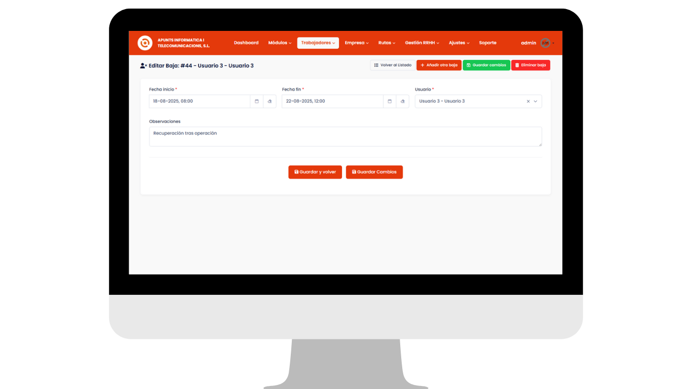 Olvídate de procesos confusos y papeleo innecesario. Nuestra funcionalidad de Bajas permite que los trabajadores registren sus ausencias indicando las fechas de inicio y fin, así como las observaciones necesarias para detallar la causa. Toda la información queda centralizada y accesible para el equipo de recursos humanos o el administrador, que podrá revisarla y mantener un control claro de cada caso.