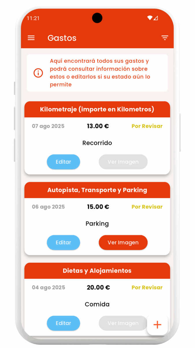 Lleva el control de tus gastos directamente desde la app, de forma rápida y sencilla. Ya sea para registrar una dieta, un desplazamiento por kilometraje o cualquier otro tipo de gasto, esta sección está diseñada para facilitarte el proceso.