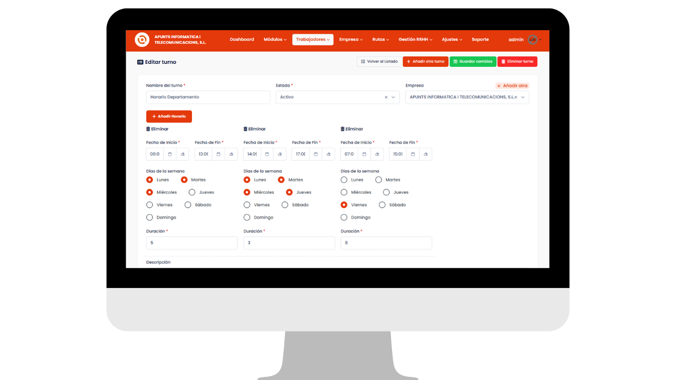 El sistema te permite organizar los horarios por días, semanas o meses, adaptarte a distintos equipos o departamentos, y mantener siempre actualizado el calendario laboral de tu empresa.