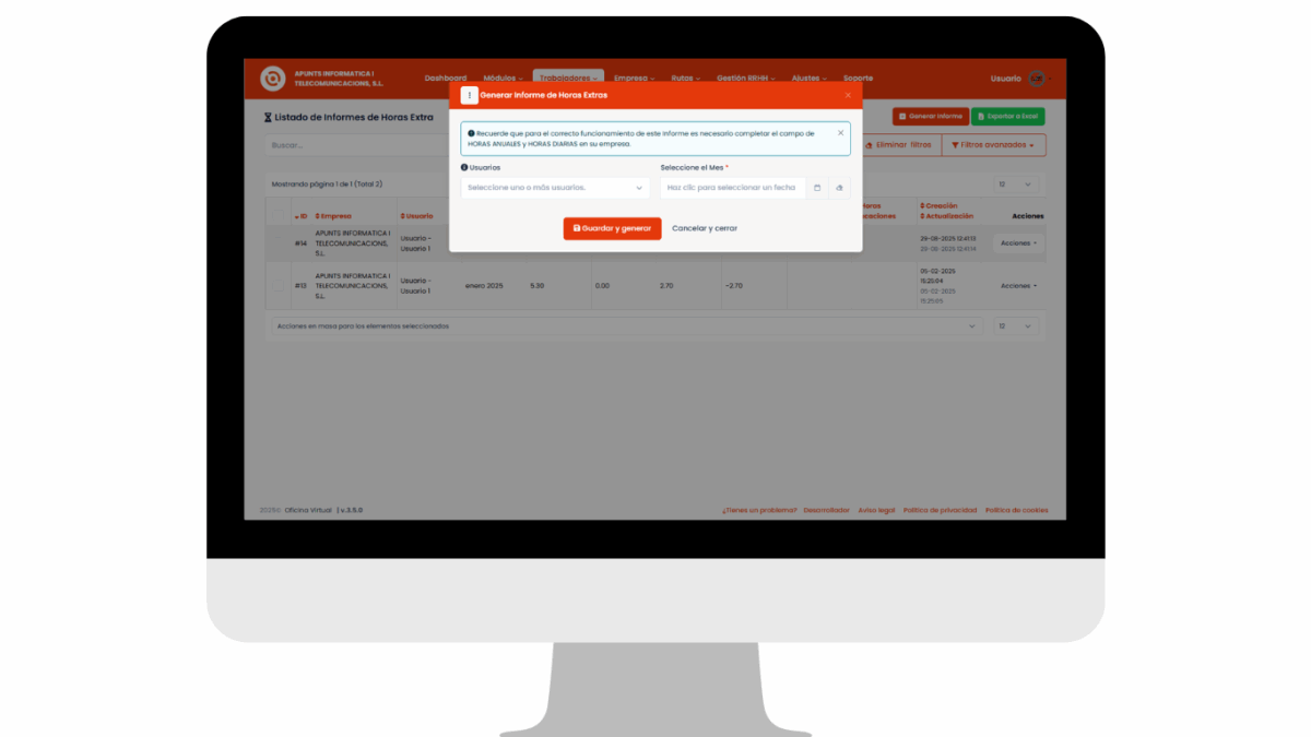 A través de un formulario sencillo, el usuario selecciona los empleados y el mes a analizar. El sistema toma automáticamente los fichajes registrados, los compara con la jornada laboral definida en la empresa (horas diarias y anuales), y genera un informe completo en cuestión de segundos.