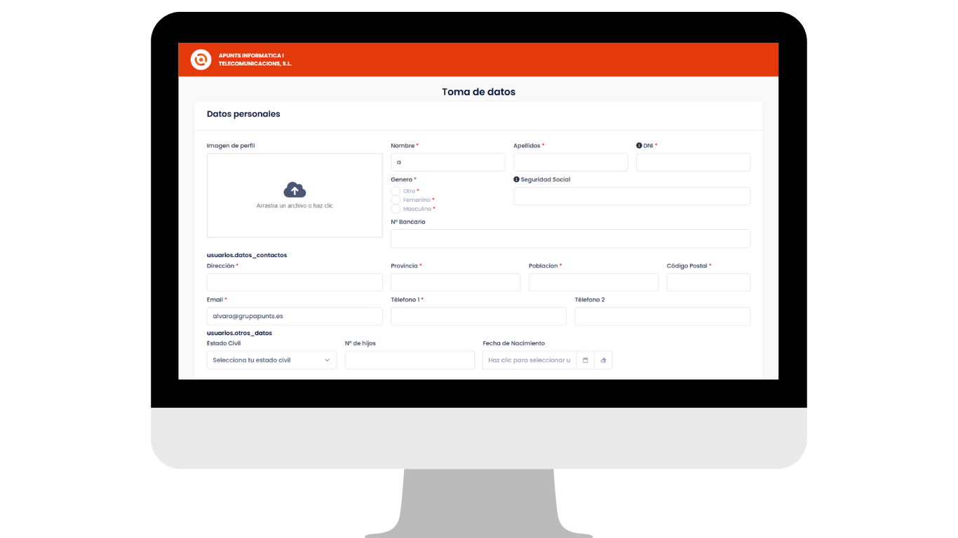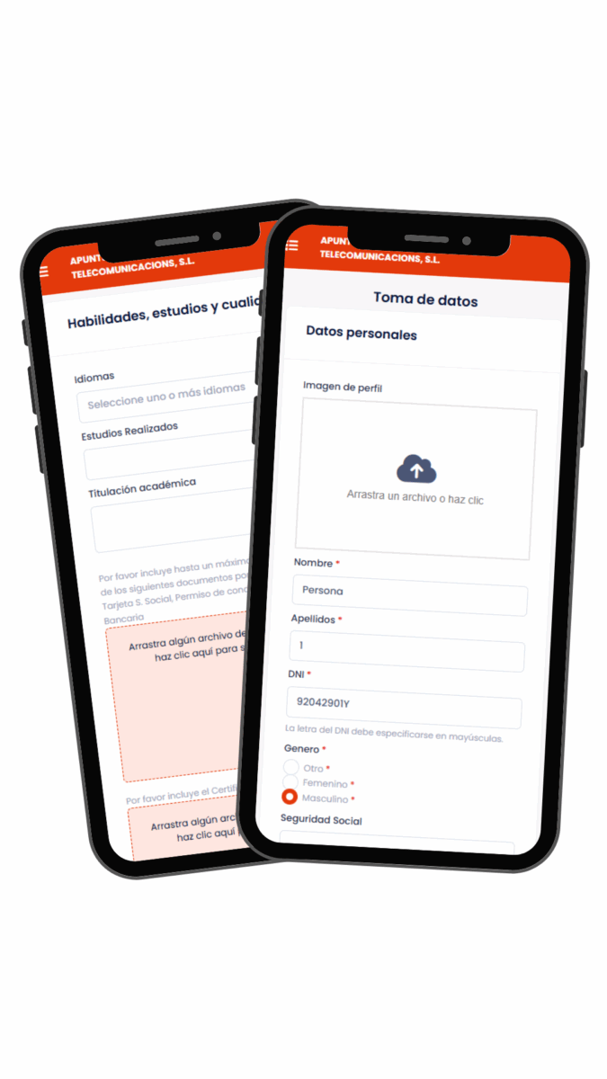 Nuestro módulo de Toma de Datos permite a las empresas gestionar de manera ágil y segura la información de sus usuarios. Olvídate de procesos manuales y repetitivos: ahora, cada usuario puede rellenar su propio formulario, generar documentos personalizados y firmarlos automáticamente, todo de forma digital y centralizada.